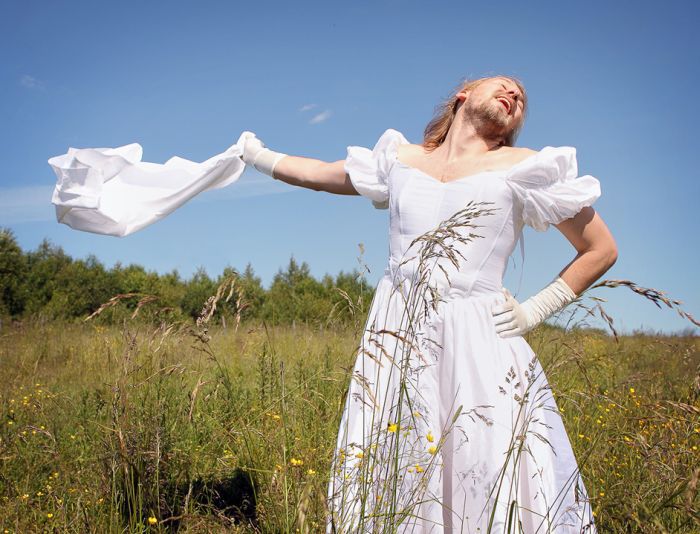 Wow, a man in a white wedding dress...how original and unique. I surely haven't seen one of those...nope, never >.>