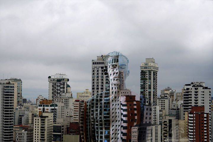 Spot the man between the buildings.