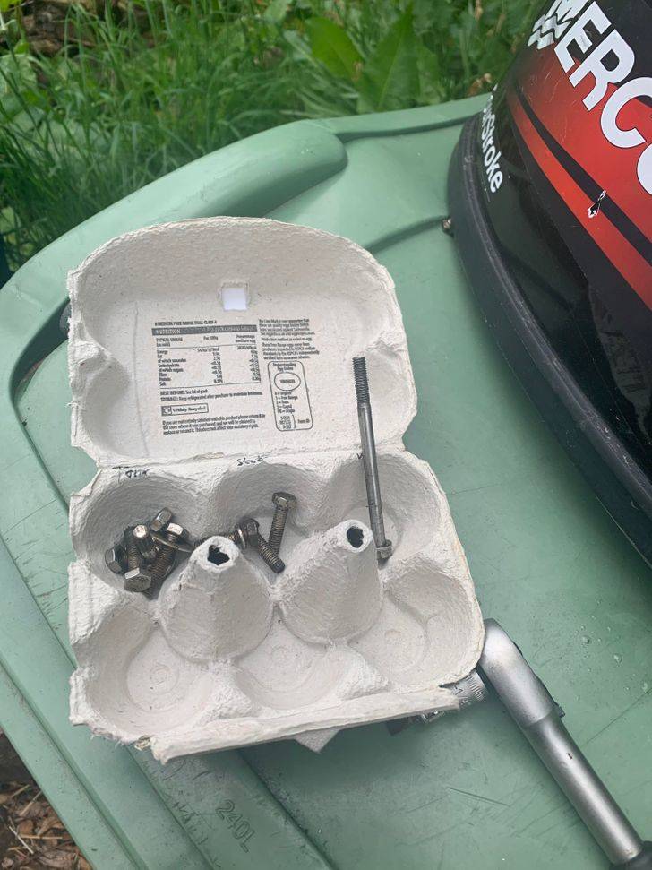 "Use an egg box to keep screws and bolts organized when taking apart an engine."