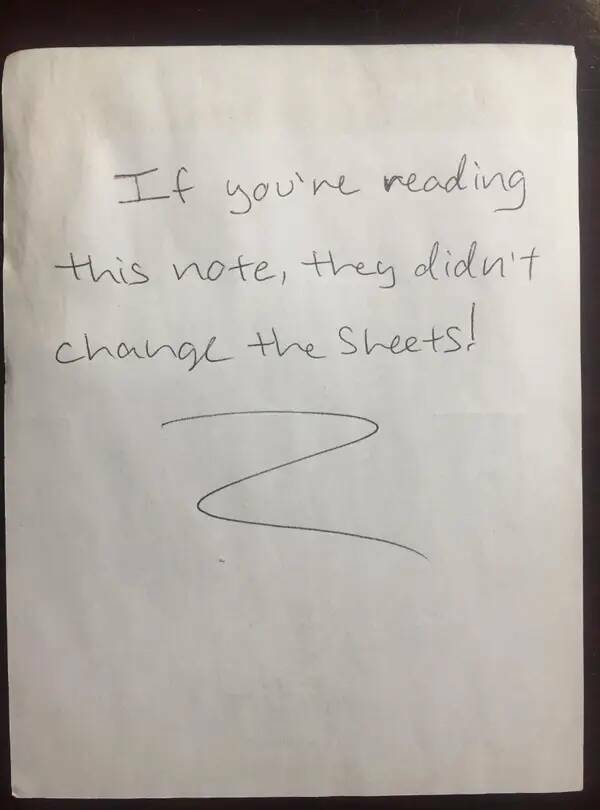And finally, this person who found a note in their hotel bed: