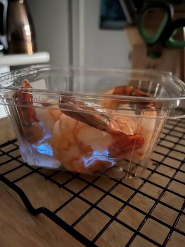 "These cooked shrimp I bought are glowing blue in the dark."
