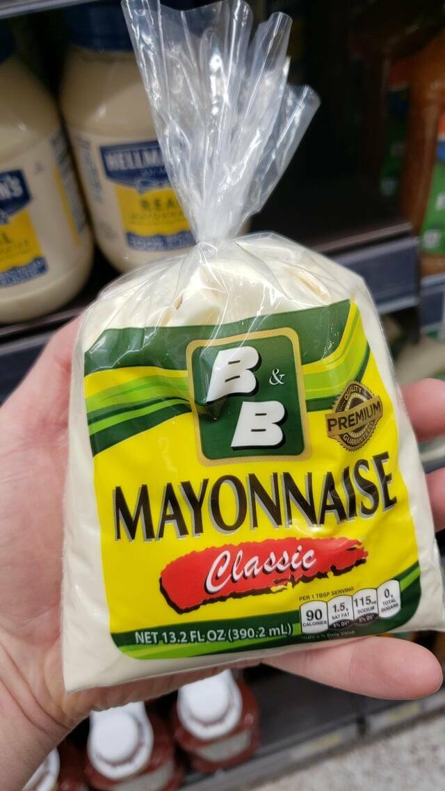 "My local supermarket (US) sells mayonnaise in bags"