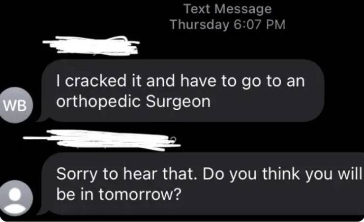 This elderly employee injured their foot AT WORK, and their boss's first reply was if they'd be in the next day.