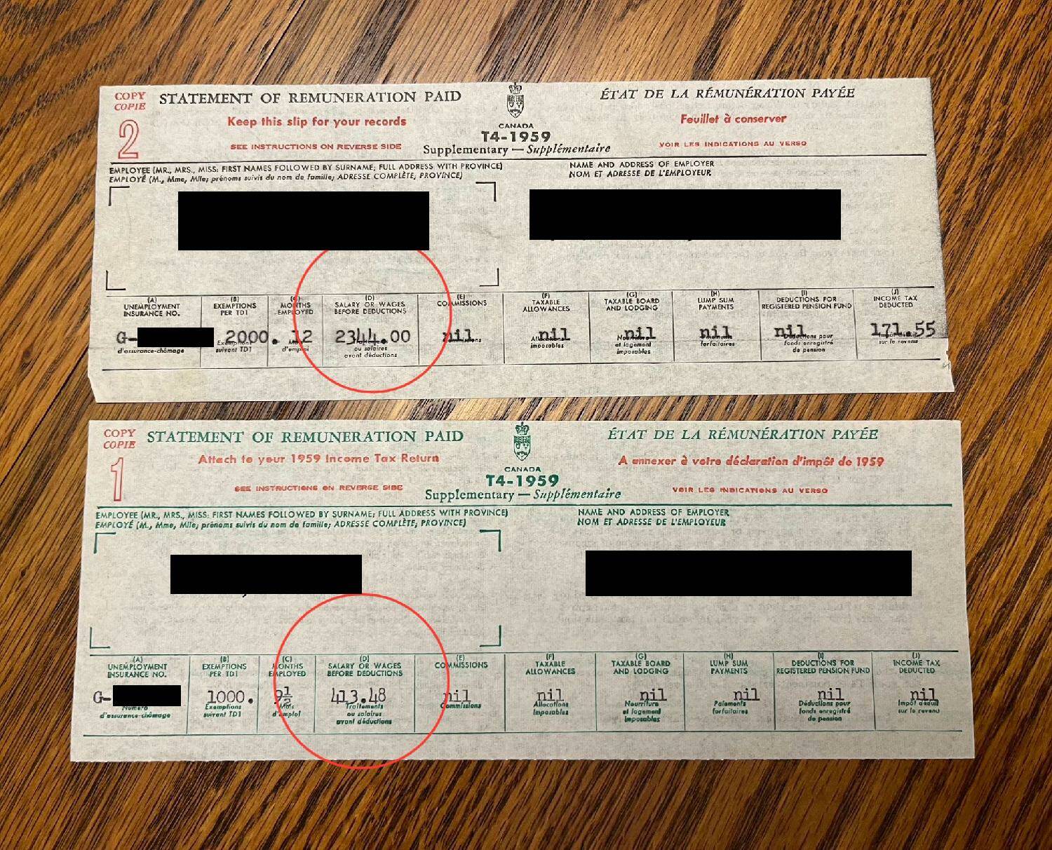 "My grandparents' T4 statements showing their annual income from 1959."