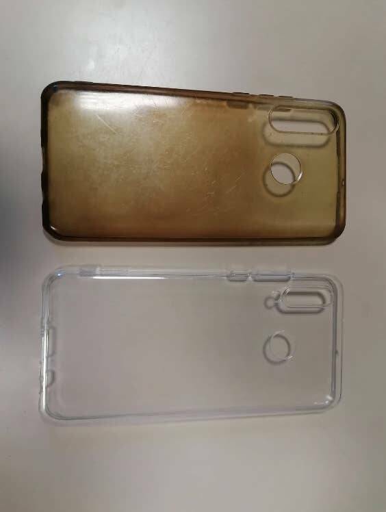 A transparent phone cover after four years of use vs. a brand new one: