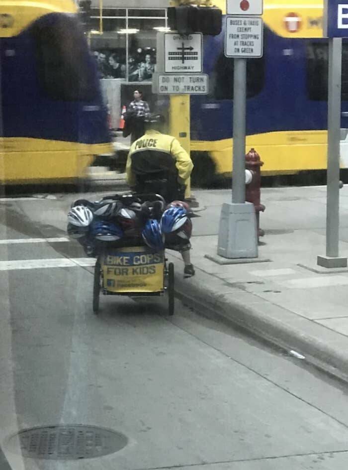 My mom would love the idea of a bike cop who just rides around handing out helmets to kids who forgot (or refused to wear) theirs.