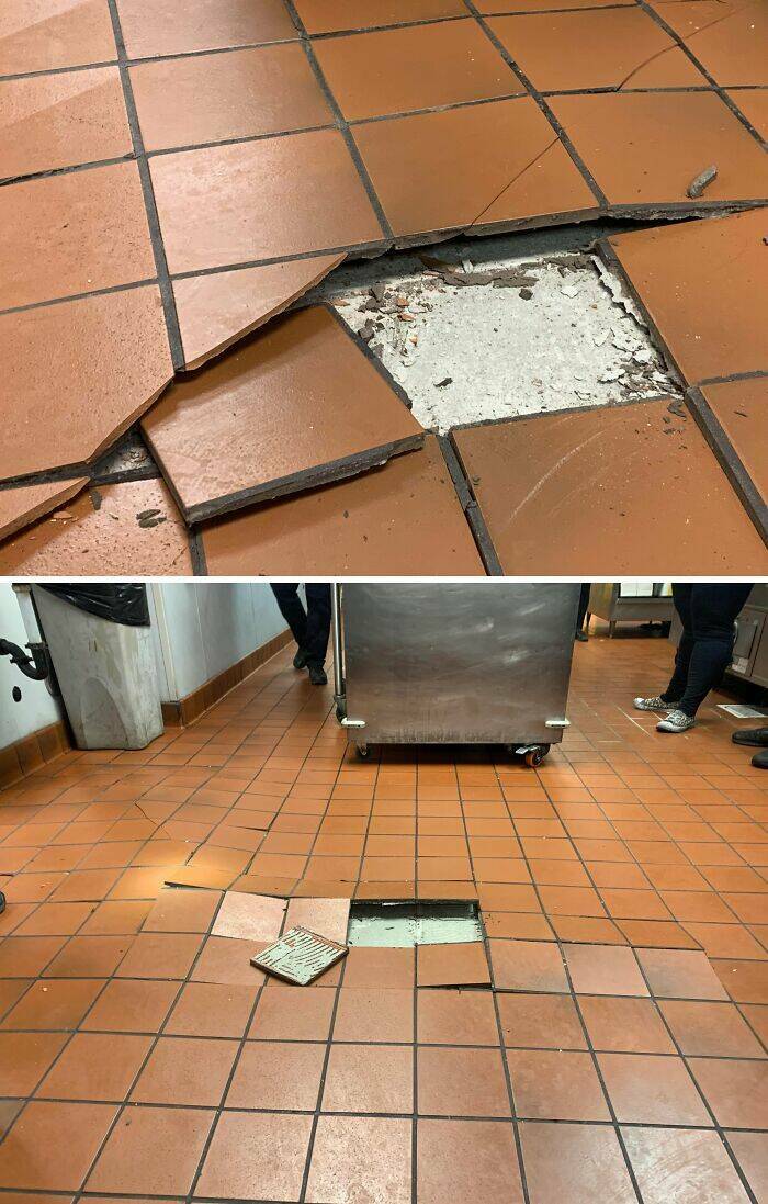 "Commercial Kitchen. Over The Last 8 Hours All These Tiles Raised Up And Actually Cracked. No Gas Line Or Water Leaks Underneath. The Tiles Were Installed 2009. Is This Just Tiles That Need To Be Reinstalled?"