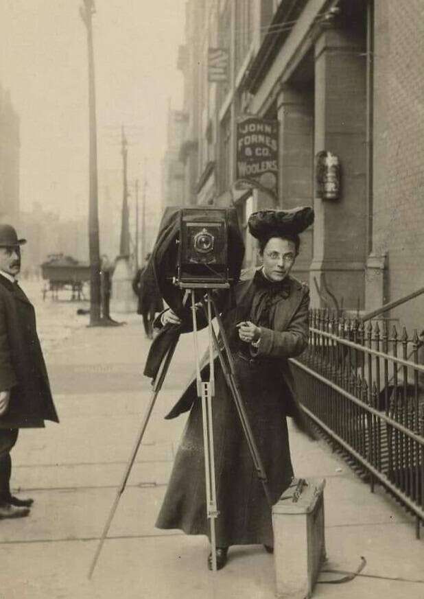 "Portrait Of American Pioneering Female Photographer, Jessie Tarbox Beals (1870-1942) Posing With Her Camera On The Streets Of Manhattan, New York Circa .1901"