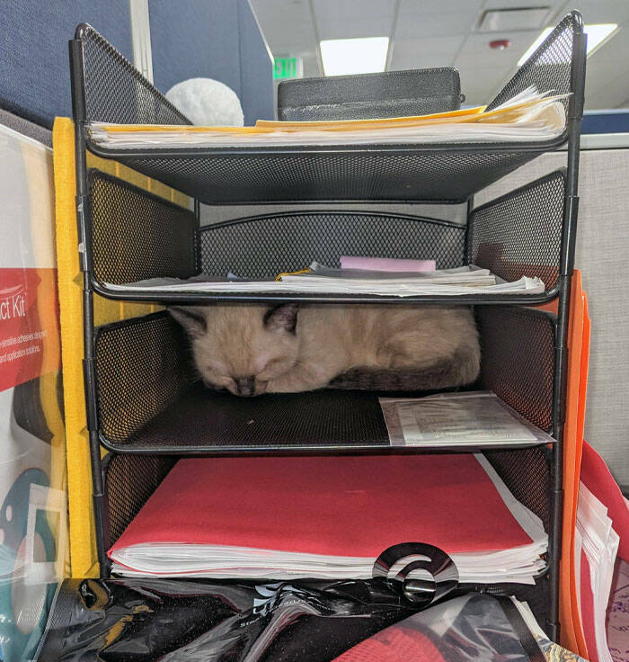 "It Is Bring Your Cat To Work Day, And Our Coworker's Cat Fell Asleep In The File Tray"