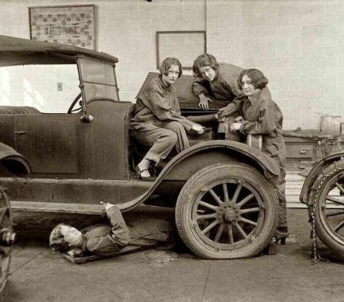 "These Progressive High School Girls Learn The Finer Points Of Auto Mechanics In 1927"