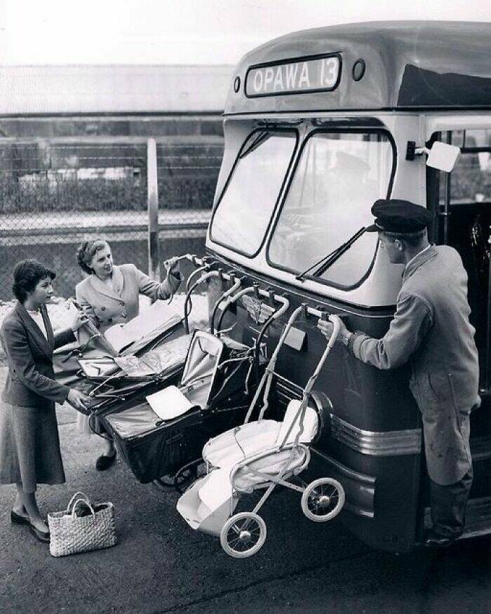 "Baby Strollers Strapped To The Front Of The Bus In Opawa, New Zealand (1950s)"