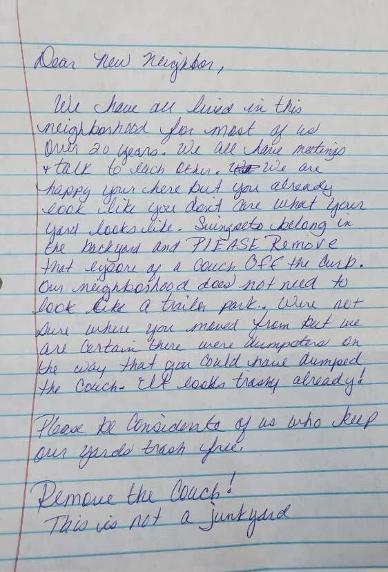 "This neighbor wrote a nice, long letter about a couch put out on the curb for pickup by a dump truck."