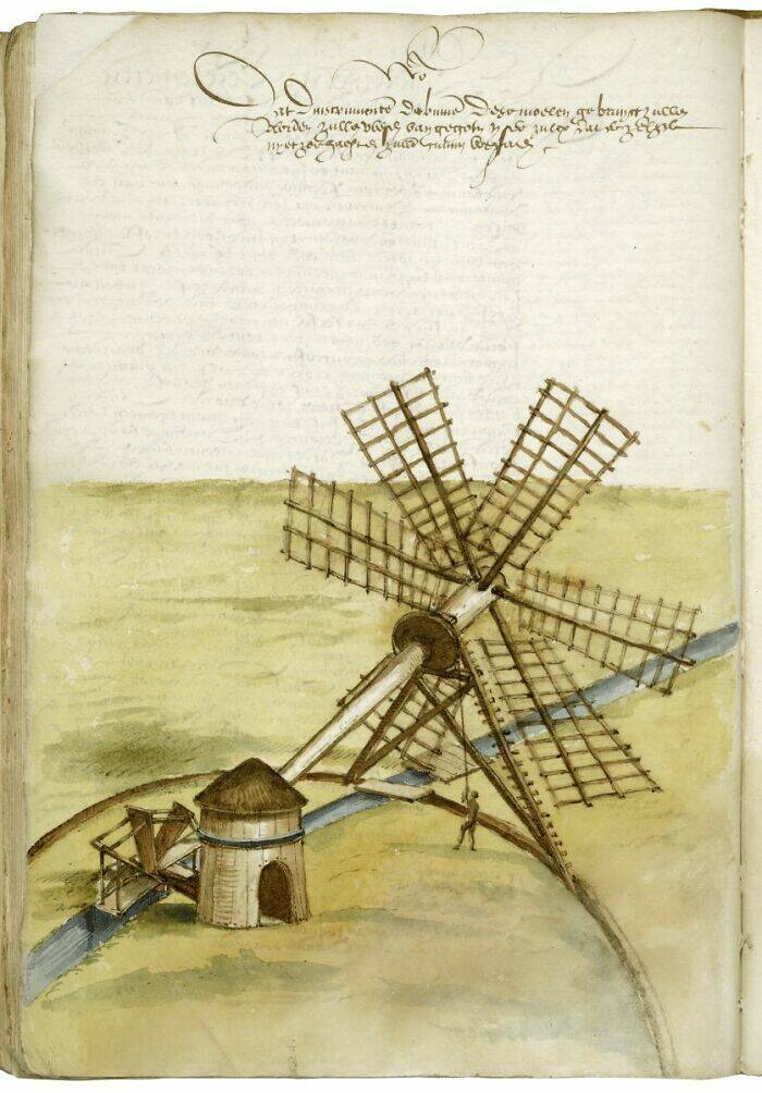 "This small watermill is suitable for grinding peat areas dry. The mill is lightweight and therefore does not sink into marshy areas. However, it was never built. C.D. Muys, 1589."