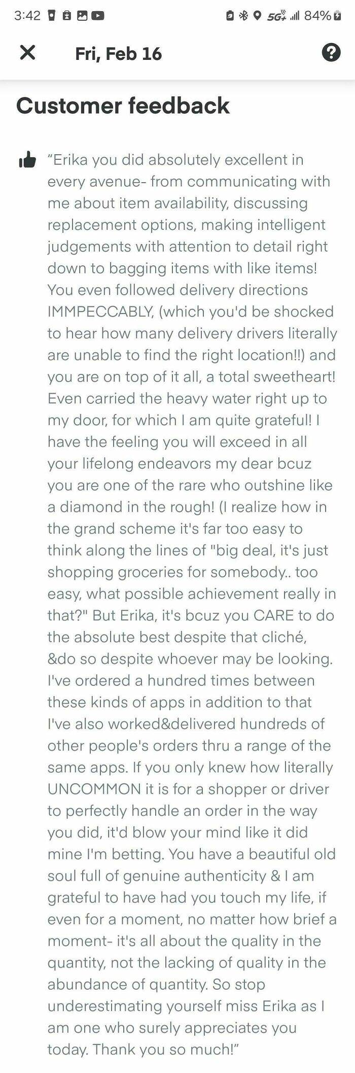 "I've never had a customer put this much effort into giving me a review and I've been doing this for over 3 years. I honestly didn't do anything special, it's how I treat all my other customers. It's really refreshing to feel noticed and appreciated. She made not just my day but my whole life lol. I'll be forever grateful."