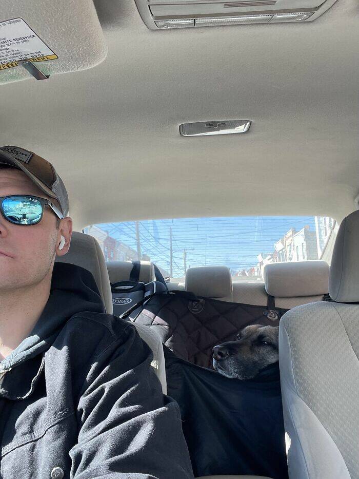 #33 My little pup lives on a dog pad on top of a box in my passenger seat. I call her my security officer since she's only 16lbs, but likes to bark when people get too close.