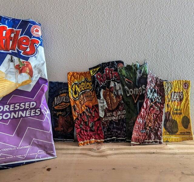 "My partner's shrunken chip bag collection (proper bag for scale)"
