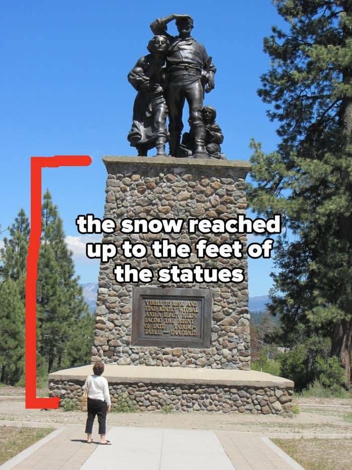 This monument to the doomed Donner Party shows just how deep the snow the unfortunate travelers had to deal with was: