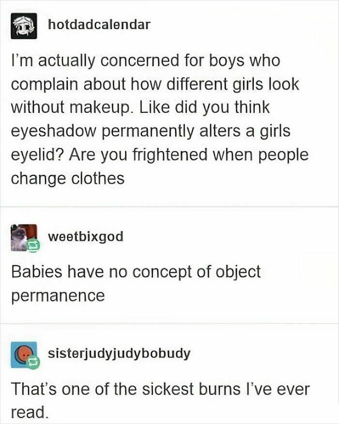 #19 I, a white af guy, passed myself off as an Iraqi by using nothing but makeup and an accent. Once, during a theater project, I gave an entire in-person interview with an educated adult, who never realized I was Irish-American. *She* wrote the article; got it published. ...But get this: I had no training in the use of make up. So, a woman trashing guys for their thoughts on women and makeup is kinda, I dunno, stupid.