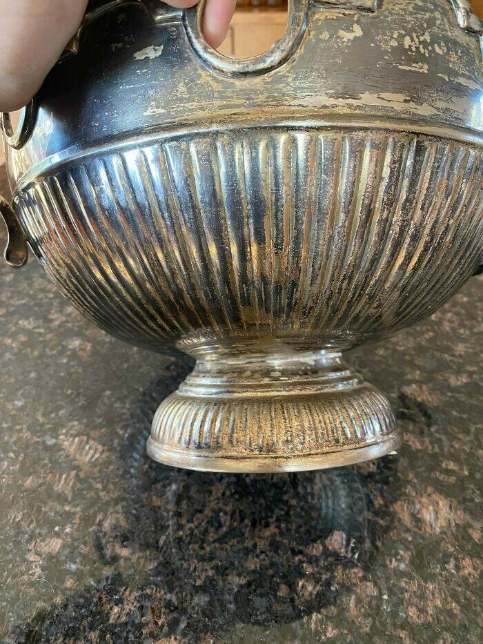 "So yesterday I found this bowl in a thrift store dumpster! Got it tested if it was actually silver, and it is! It’s 3lbs 13.9oz, (61.9oz). This is by far my best find!"