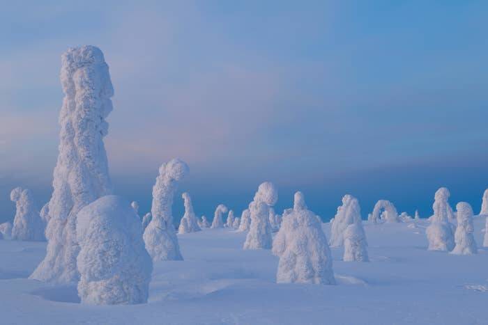 In Finland's Riisitunturi National Park, the extreme cold transforms trees into stunning, snow-covered sculptures, creating a surreal winter landscape: