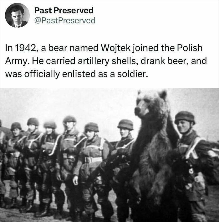 "Wojtek, a bear adopted by the Polish Army during World War II, became an iconic member of the 22nd Artillery Supply Company. Found as a cub in Iran in 1942, he was trained by soldiers to carry artillery shells and supplies, and even participated in the Battle of Monte Cassino in 1944. Due to his contributions, Wojtek was officially enlisted as a soldier, given a rank, and issued a service number. Wojtek’s unusual military service included enjoying beer with the troops, and he became a beloved mascot. After the war, he was relocated to the Edinburgh Zoo in Scotland, where he lived until his death in 1963. His story remains a testament to the bond between soldiers and the animals they encountered during wartime."