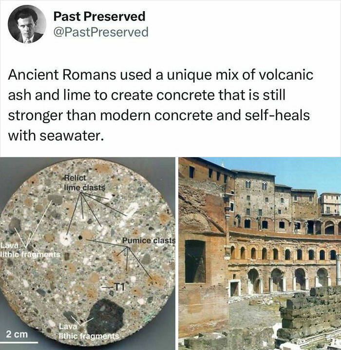 "Ancient Roman concrete has proven to be far more durable than most modern-day concrete. Unlike modern mixtures that degrade over time, Roman concrete is known for its ability to actually strengthen when exposed to seawater, a quality found in structures like the Pantheon and coastal piers that have stood for nearly two millennia. The secret lies in a unique blend of volcanic ash (often collected from Mount Vesuvius), lime, and seawater. These minerals react chemically over time to form new crystalline structures, fortifying the strength and durability of the concrete itself. This “self-healing” property allowed Roman marine structures to endure and even thrive despite millennia of weathering, leaving modern scientists studying its composition as they seek to replicate its strength for future construction."