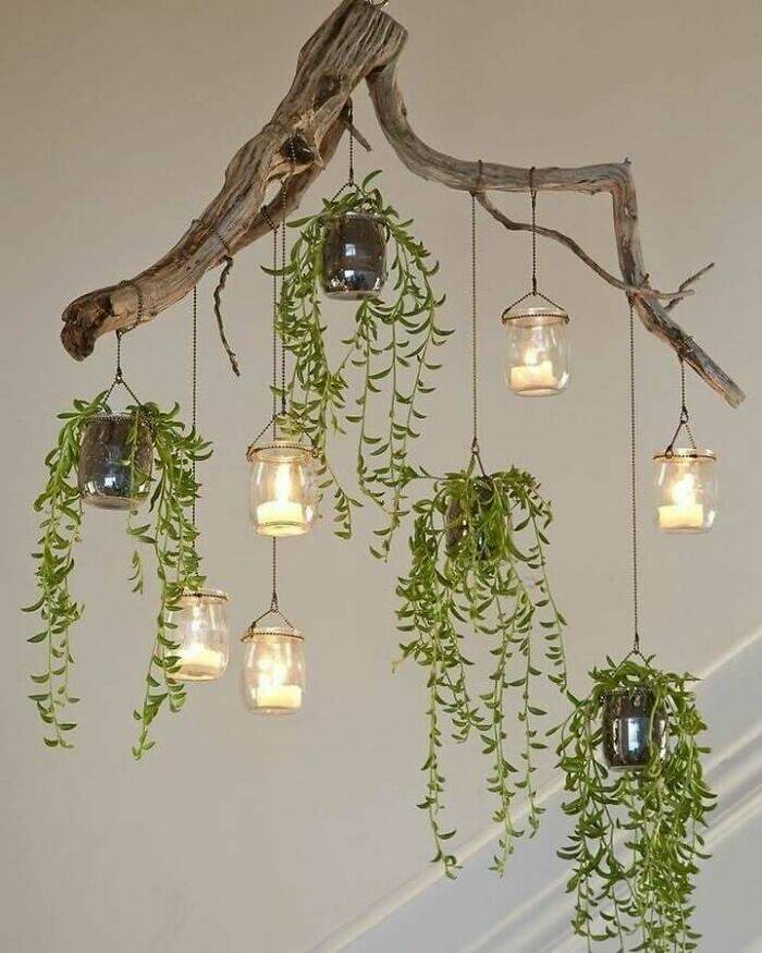 "A Beautiful Piece Of Driftwood, Some Jars And Flameless Votives And Trailing Succulent Plants Create A Unique And Lovely "Chandelier""