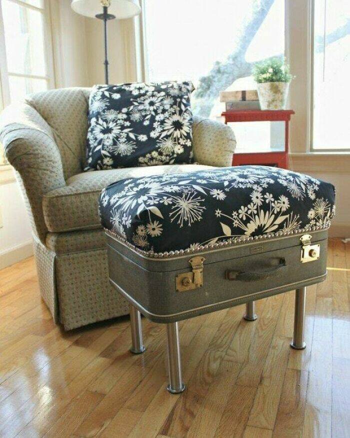 "An Old Suitcase Is Give A Beautiful New Update As An Ottoman! I Love The Matching Pillow Fabric To Bring It All Together"