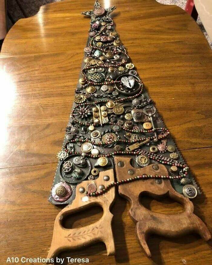 "Awesome Inspiration! Two Hand Saws Joined Together And Decorated With All Kinds Of Repurposed/Broken Jewelry Bit, Buttons And Chains!"