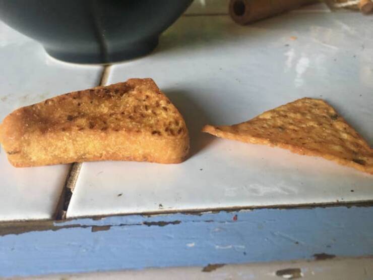 This abnormally thick Dorito someone found in an otherwise normal packet, which apparently almost broke their tooth when they tried biting into it: