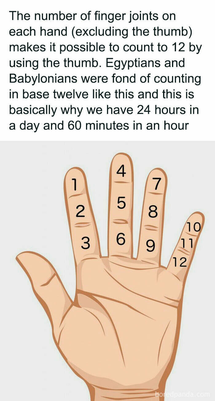 "The number of finger joints on each hand (excluding the thumb) makes it possible to count to 12 by using the thumb. Egyptians and Babylonians were fond of counting in base twelve like this and this is basically why we have 24 hours in a day and 60 minutes in an hour"