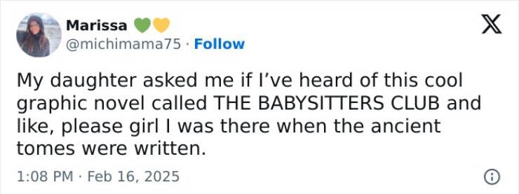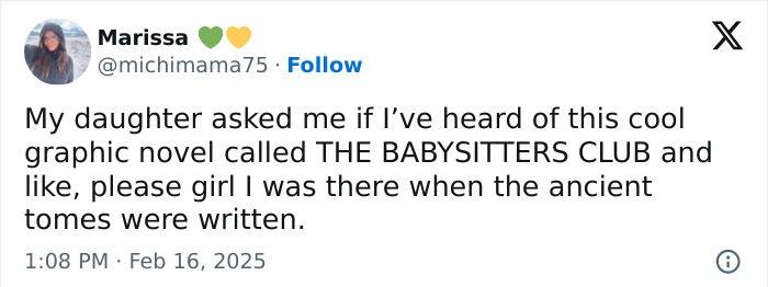#47 They made a Graphic novel of it? I was there when The Babysitters Club was just a series of paperback books with newsprint quality paper that was faded to a deep tan and tore if you turned them page wrong.