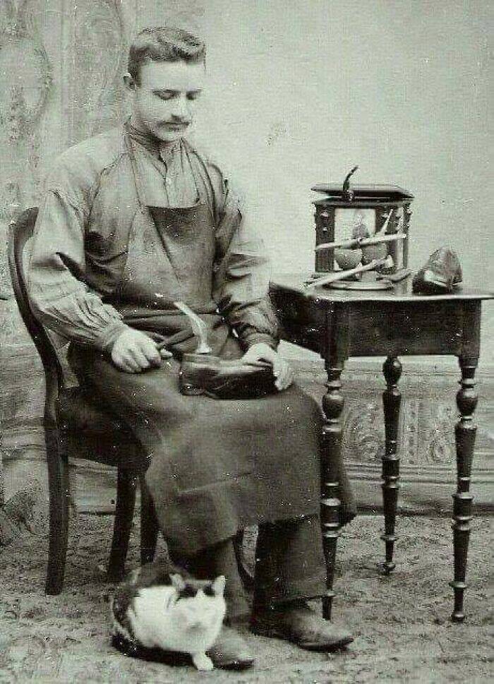 "Shoemaker and his cat. Mid 19th century"