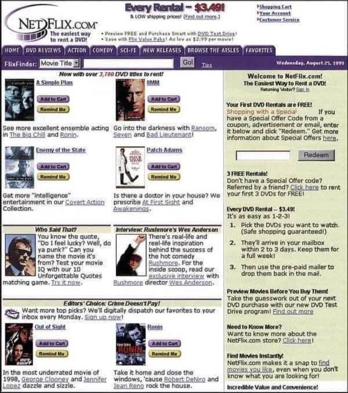 This is what Netflix's homepage looked like in 1999, one year after it launched: