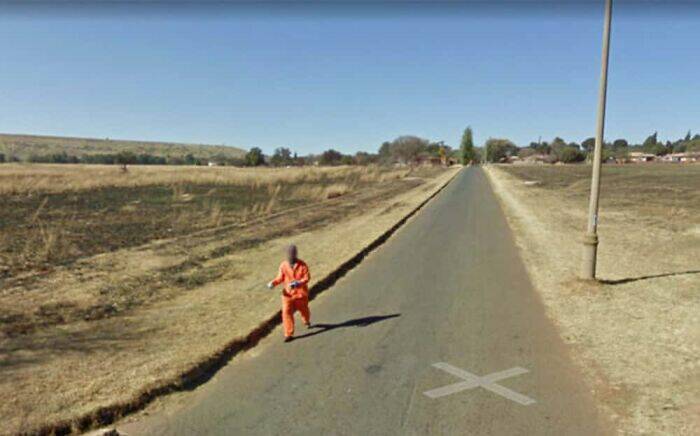 "This image was captured in South Africa in 2010. While the man depicted in the image capture looks like an escapee from the United States, many pointed out he could be a municipal worker. In South Africa, some municipal workers wear orange as part of their uniform.