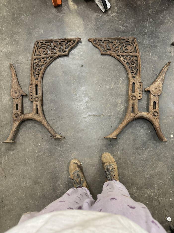 This pair of heavy metal legs that contain screw holes:
