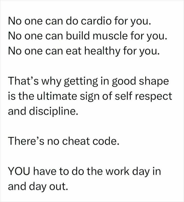 Awesome. A bunch of cheap inspirational quotes. I exercise and it hurts. I eat under 60g carbs for a month and lose 3 lbs while being weak, unfocused, and in constant muscle and joint pain, while on Ozempic with headaches and stomach pain. Yeah, obey your doctors at your own risk.