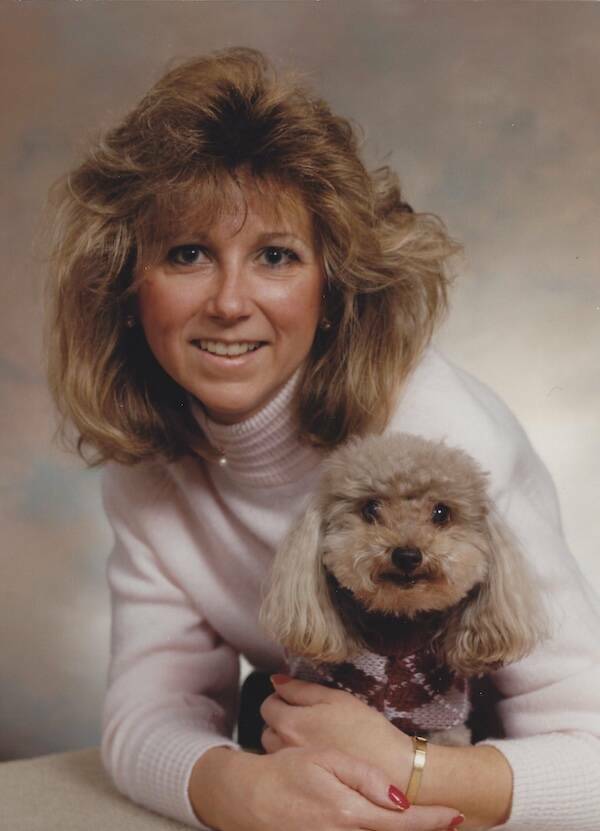 "My beloved aunt and her poodle serving this glorious early 90s moment."