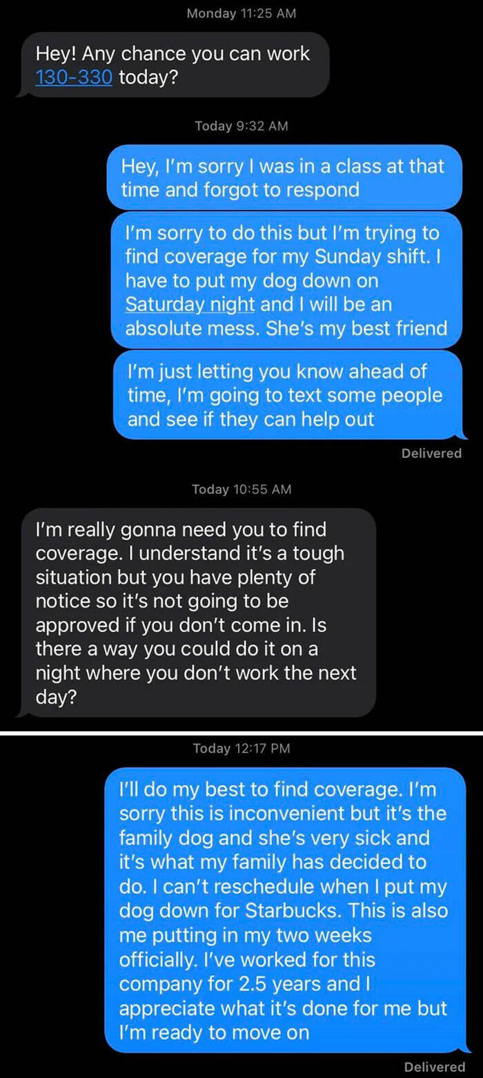 "This was what I received from my boss after asking for help regarding having to put my dog to sleep and not being able to make my 5 AM shift because of it. I worked at Starbucks for over 2.5 years and called out/was out sick a total of three or four times."