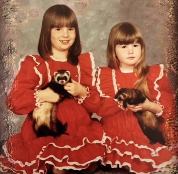 “My parents raised ferrets and here’s me and my sister posing with Bandit and Farrah in Lancaster, Ohio 1981.” ⁠