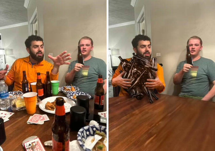''Can Someone Remove All Of The Items On The Table? The Bottle In Hand Can Stay''