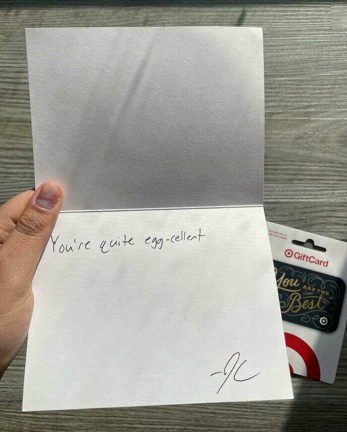 "My dad’s been a laborer with his company for 20 years. To congratulate him they give him a card with an attached gift card. The card just said: “You’re egg-cellent.”"