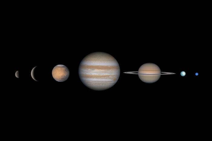 "This image presents all the planets of our Solar System, excluding Earth, showcasing their unique characteristics. Mercury, the closest to the Sun, is a barren, cratered world, while Venus is shrouded in thick clouds. Mars, the Red Planet, has vast deserts and the largest volcano in the Solar System. The gas giants, Jupiter and Saturn, dominate with their immense size and swirling storms, while Saturn’s rings make it especially striking. Uranus and Neptune, the ice giants, are rich in methane, giving them their blue hue."