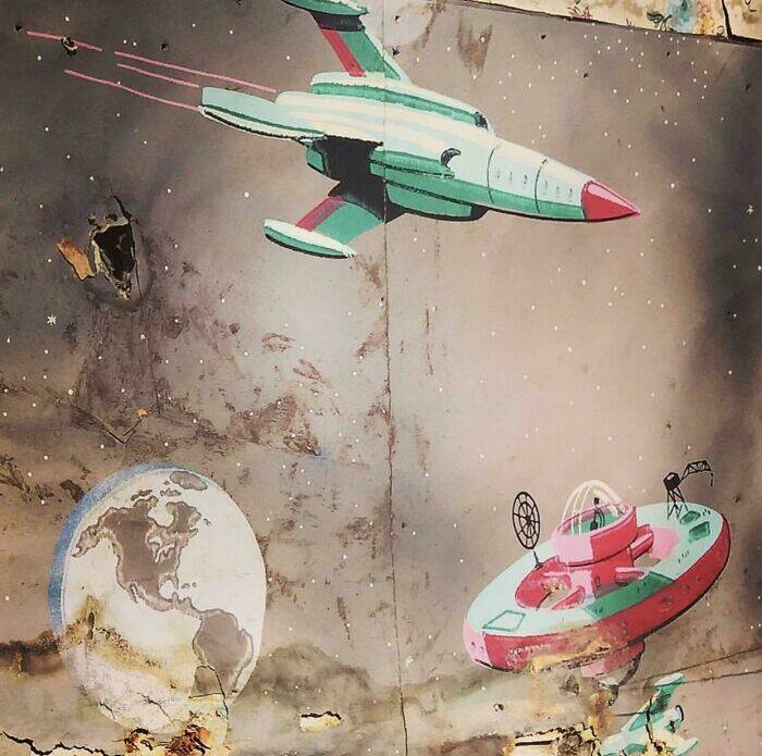 "This Vintage Space Themed Wallpaper Found Under 3 Layers Of Other Wallpaper In An Old Farm House"