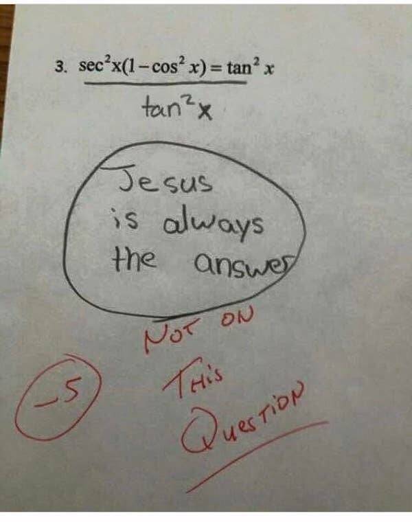 And the struggling math student who tried — and failed — to use Jesus to pass a test: