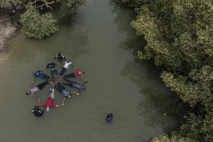 As part of FAO’s FISH4ACP program, the Gambian Navy teaches oyster harvesters to swim—giving women lifesaving skills and reducing drowning risks in the mangroves. Most had never learned to swim. These women play a vital role in protecting mangroves from illegal deforestation, safeguarding ecosystems that store up to 10 times more carbon than terrestrial forests and are crucial in fighting climate change.