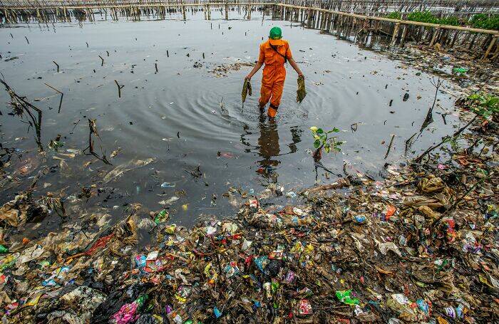 “A worker is cleaning the never ending rubbish in a mangrove restoration plot.”