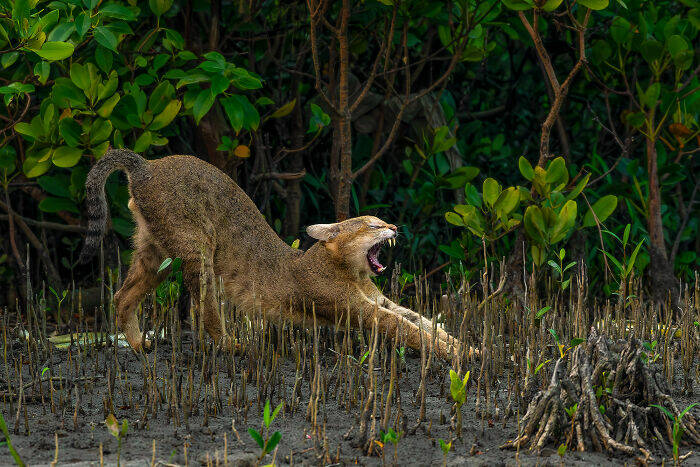 In the heart of the Sundarbans, the elusive Jungle Cat awakens with a powerful yawn — revealing nature’s sharp edge amid the tangled roots and tidal waters of the mangrove wilderness.