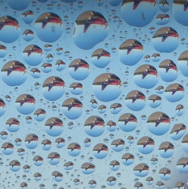 “Water droplets on a plane window.”