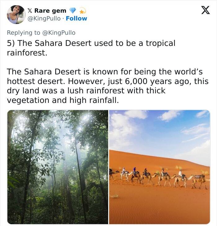 #10 False. Sahara climate has not changed significantly since the tectonic plates of South America broke and drifted from Africa. Also, we would expect to find old stumps or river beds or something. Additionally Egypt existed in history 6000 years ago because the Nile River provided water in the desert....
